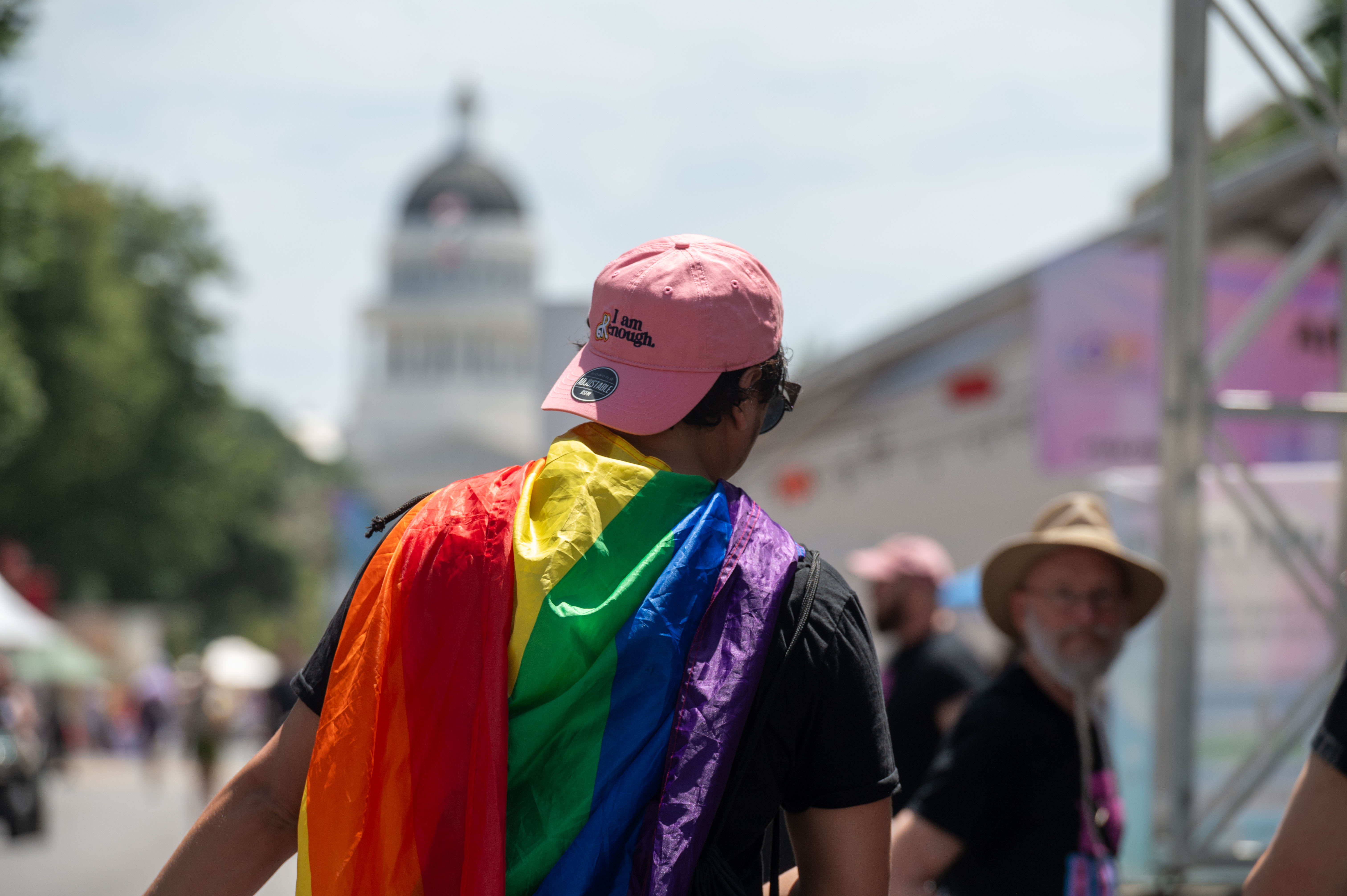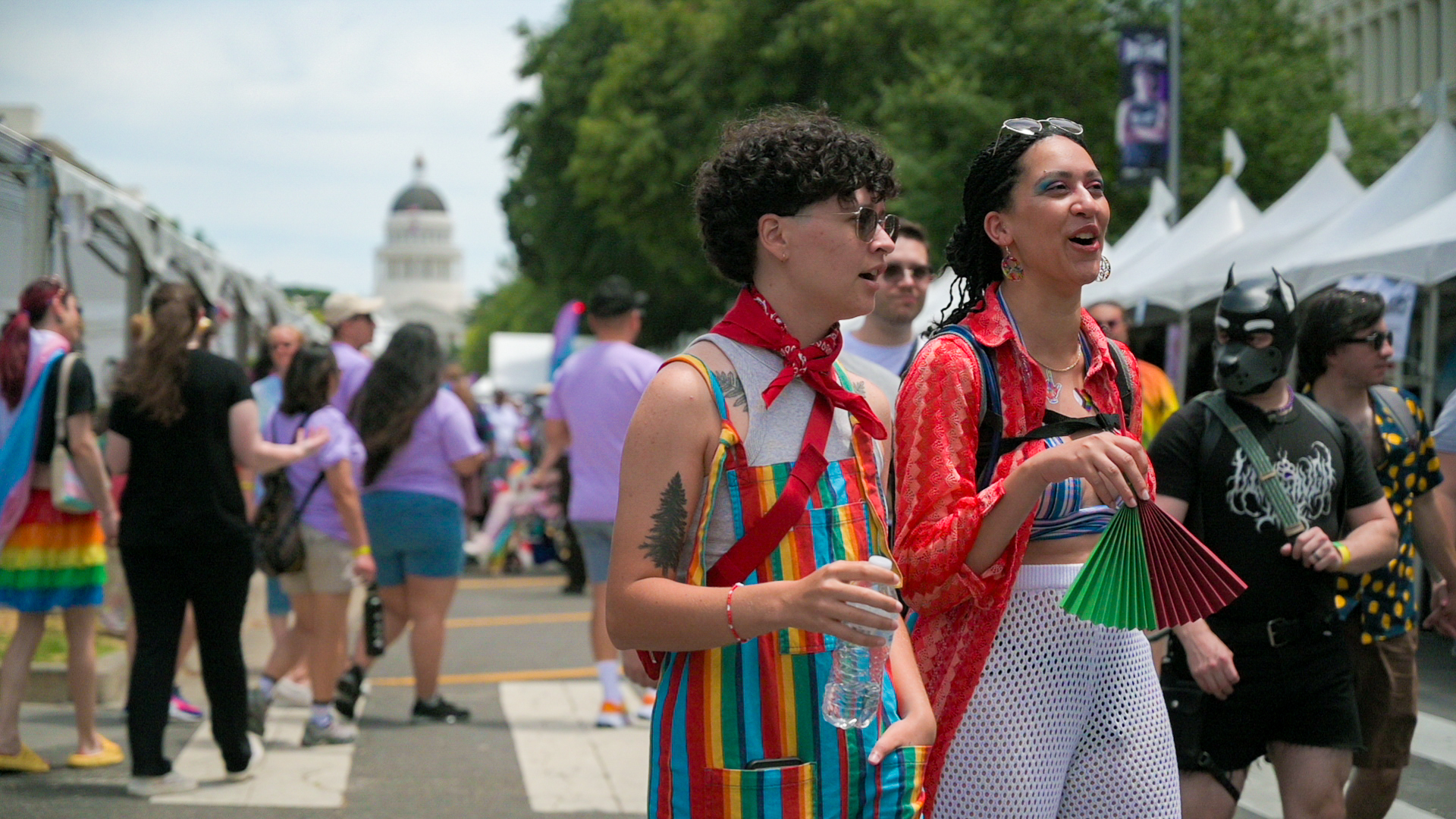 Two concert attendees fist bump at the Vanilla Ice concert on the Golden 1 Stage during the California State Fair at Cal Expo on Friday, July 12, 2024, in Sacramento.