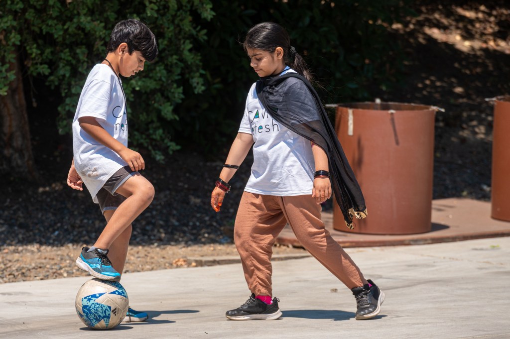 Siblings Abuzaid Rahmani, 9, and Zenat Rahmani, 10, play soccer together at Camp Nefesh in Sacramento on June 19, 2024. The Rahmani family came to Sacramento from Afghanistan in 2019.